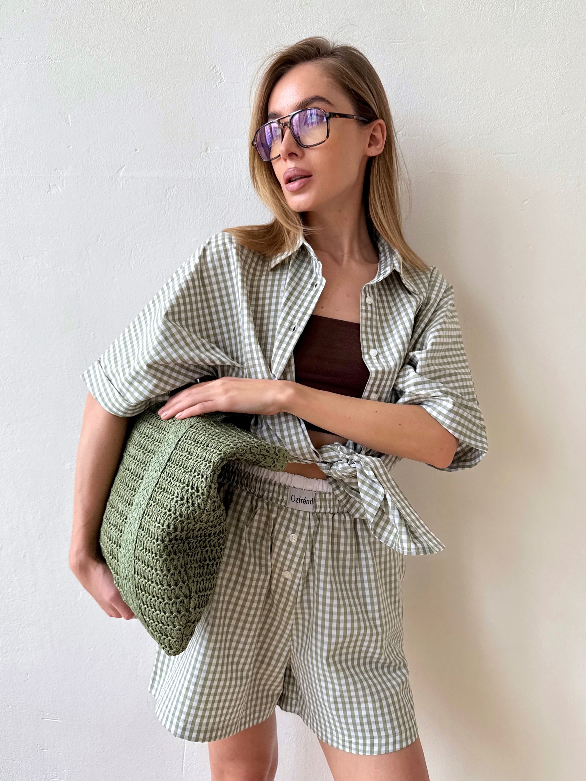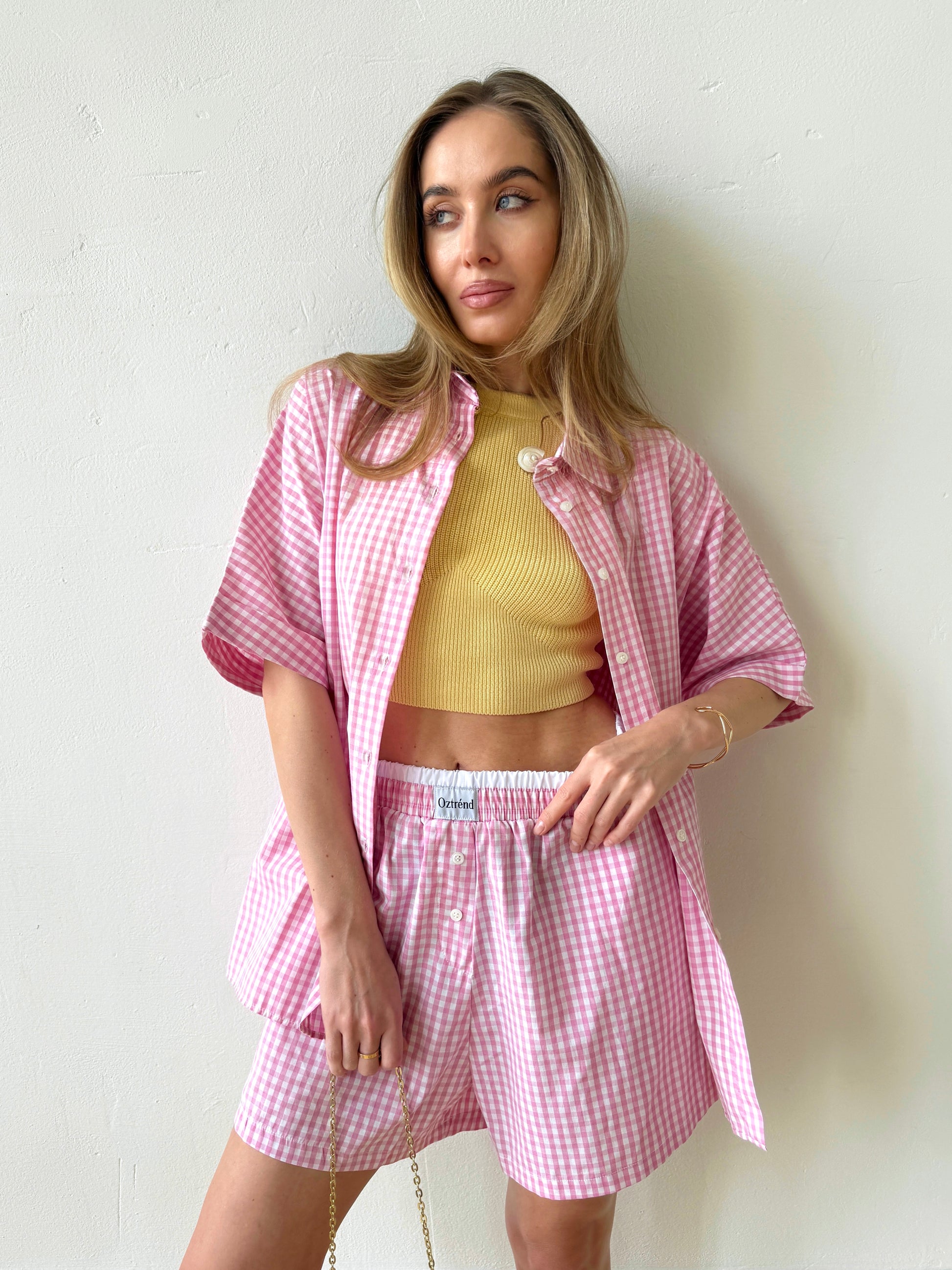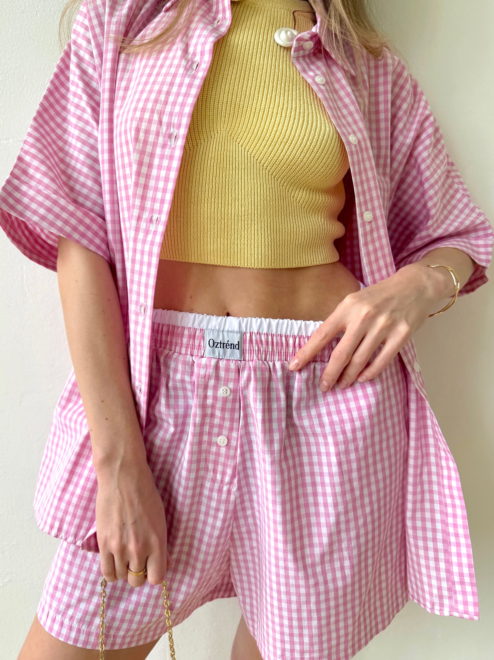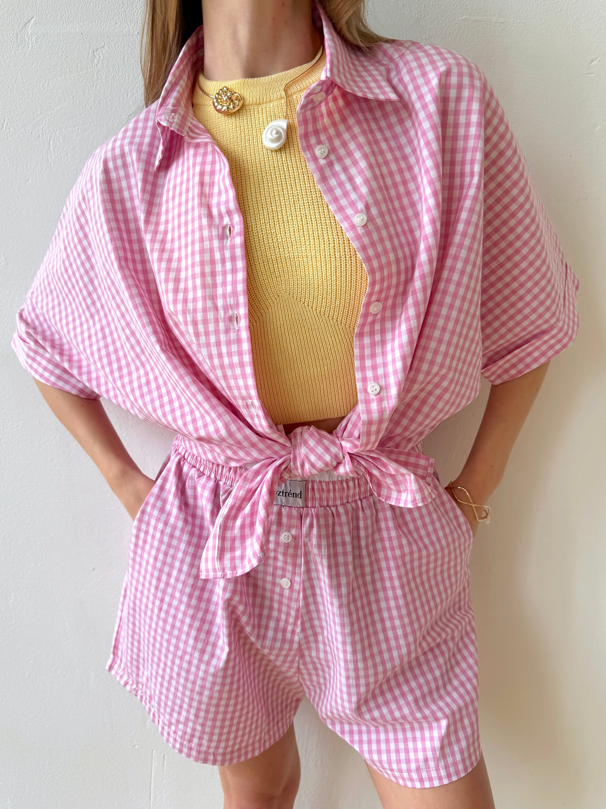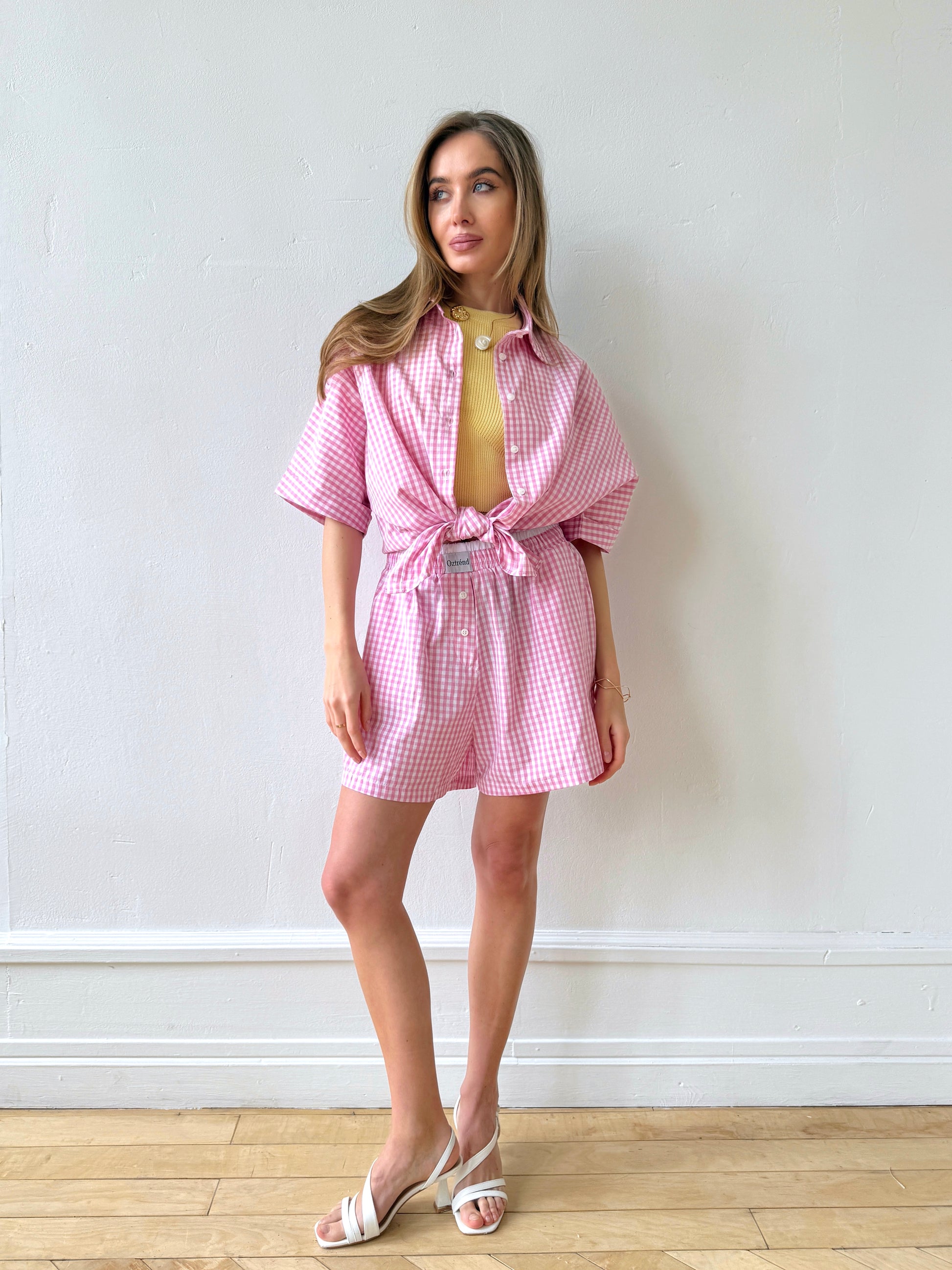 The Check&Chill suit is the perfect combination of style and convenience. The shirt has cutouts on the sides that allow you to tie it at the waist, creating a stylish and feminine silhouette. High-rise shorts that accentuate your figure and add lightness to your look.